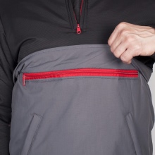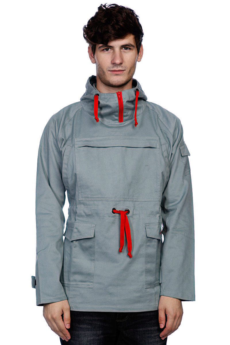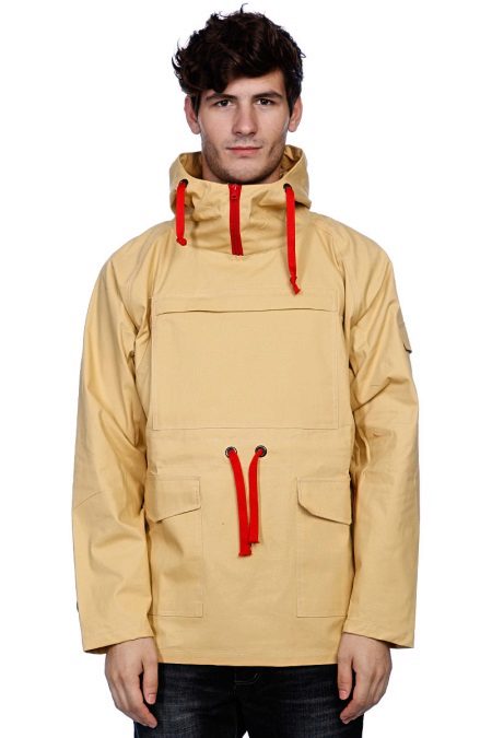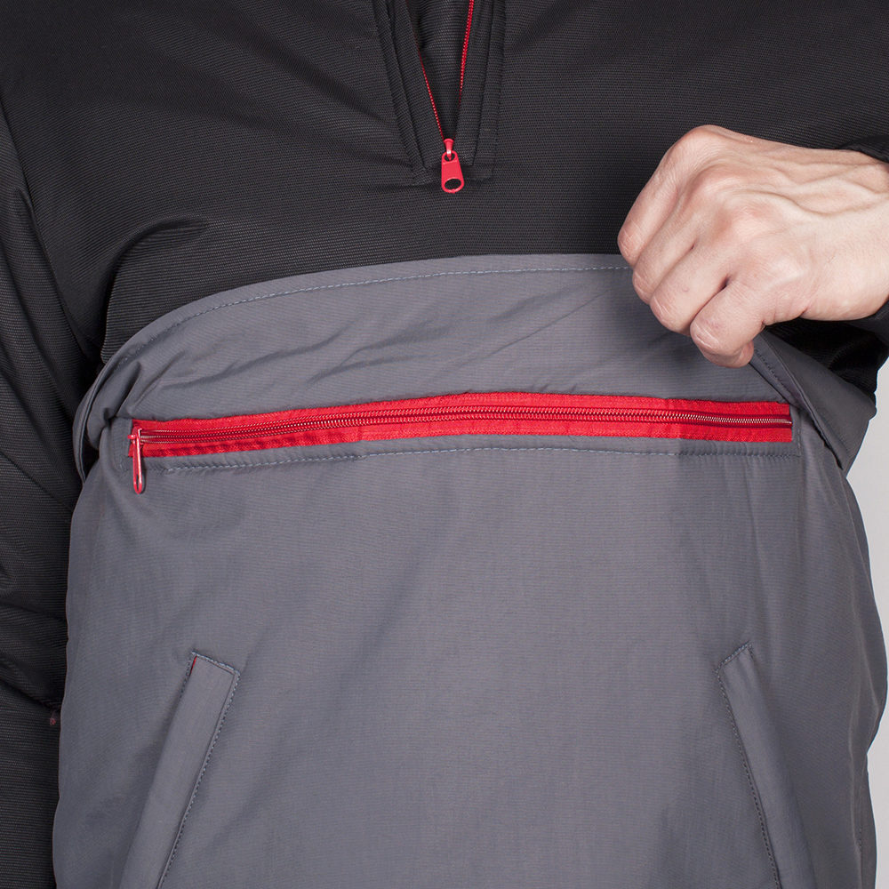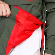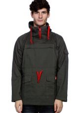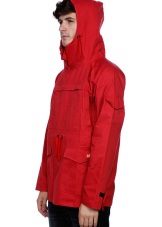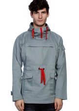 Here are observed classic for anorak pockets (big chest, small on the sleeve), and there are additional overhead on the sides. Lightning in the area of the side seams - for ventilation. Sleeves are pulled down by velcro, hood is drawn by drawstring.