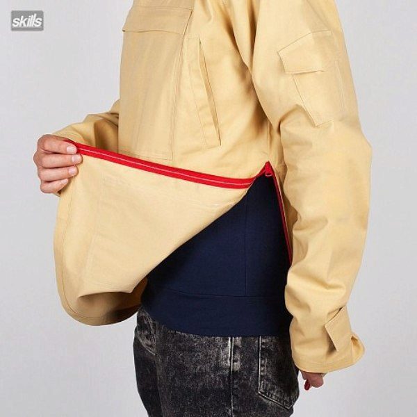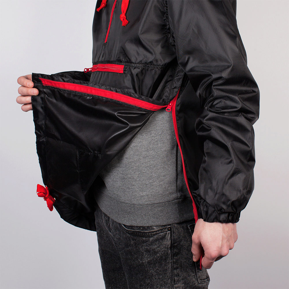 For greater comfort when worn to the breast patch pocket at the bottom added pocket-kangaroo. Ventilation is provided by holes in the armpits and side zippers. Such an anorak weighs very little and folds up to its minimum size - into a compact handbag.