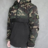 The model is made of different fabrics. Top and hood - light cotton muslin with polyurethane impregnation (high degree of protection from moisture). Bottom - tarred linen-nylon fabric with camouflage print (light protection from moisture). All zippers on this jacket are hidden, they are complemented by buttons.