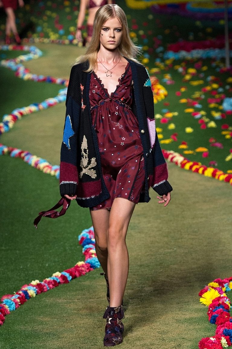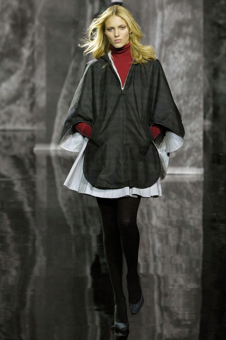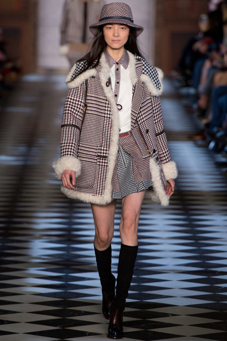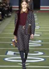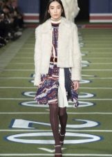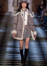 Coats and tweed jackets with fur trim, pullovers and turtlenecks, double-breasted jackets, black and white monochrome, accents from the original colors, strip, cell, goose foot - this is the brand's business cards.