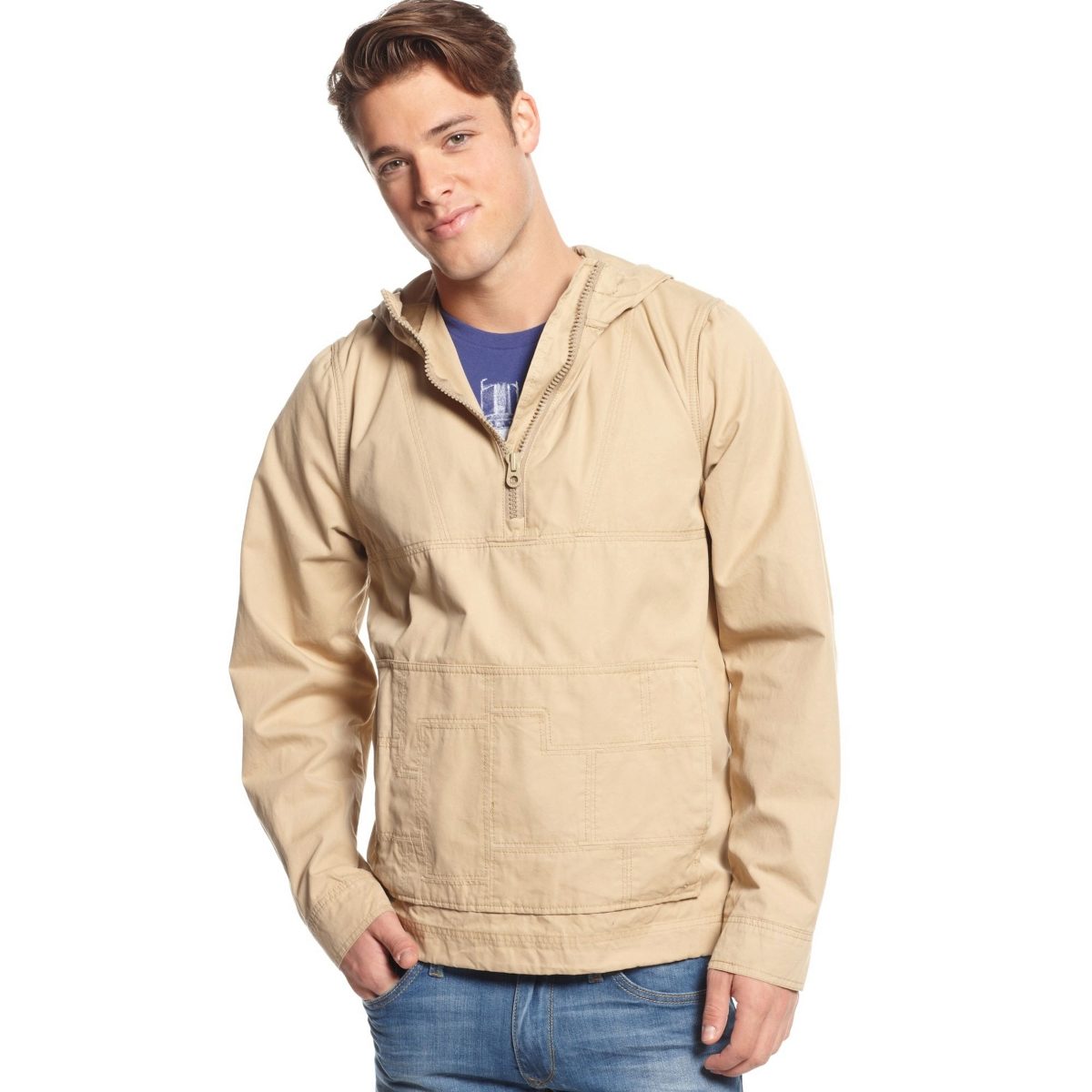 Monochrome classic anorak models for Tommy Hilfiger are not typical. Is that only HOODED PULLOVER ANORAK KHAKI JACKET. Such an anorak is made in beige color, has a straight cut and a standard set of distinctive features of a classic anorak, except for the stretch on the hood and the lower edge of the hem.