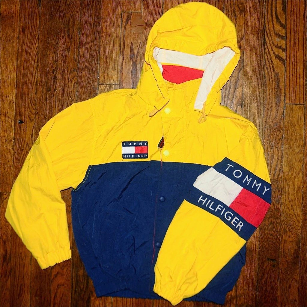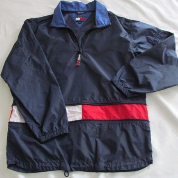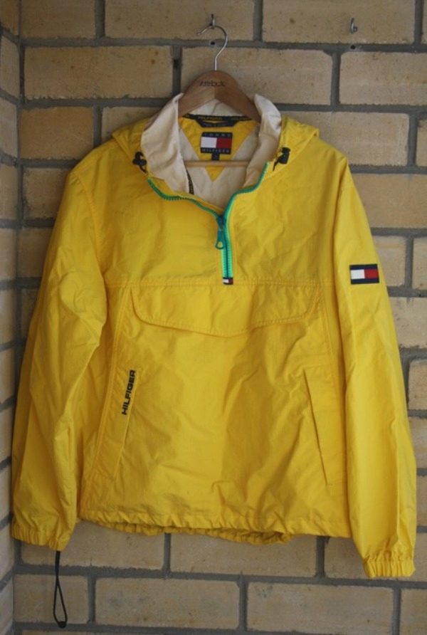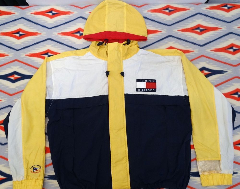 VTG TOMMY HILFIGER SAILING GEAR COLORBLOCK USA FLAG ANORAK JACKET SPORT 92 POLO is another bright retro variation. This is a reliable windproof jacket. On a yellow background - the color scheme of the company logo - red, white, blue, and the name of the brand. The hem and cuffs are adjustable with a rubber band and the collar width is laced.