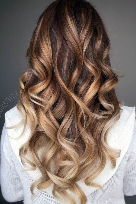 To make curls of such length look beautiful, it is very important to create a smooth color transition when coloring. This color gradient looks great not only on straight hair, but also on curly. In order to achieve a smooth transition of colors, the specialist during the staining of curls with strokes in the vertical direction puts paint on the tips, as if it looks like.