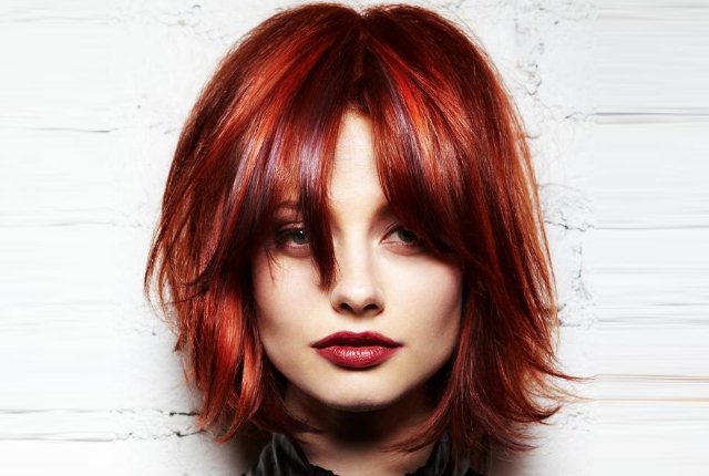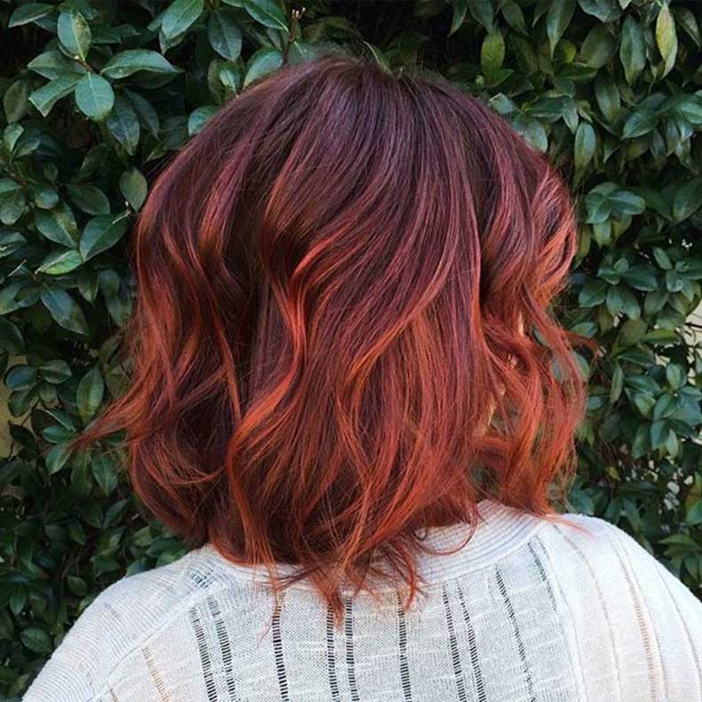 - The natural warmth of the hair is emphasized by coloring in shades of copper.
