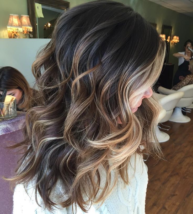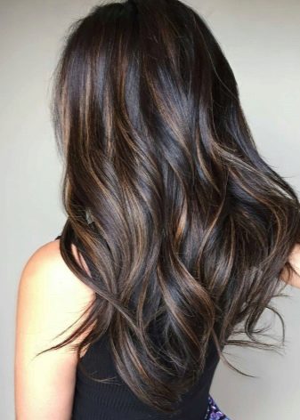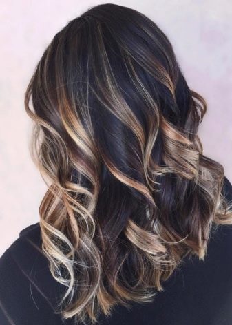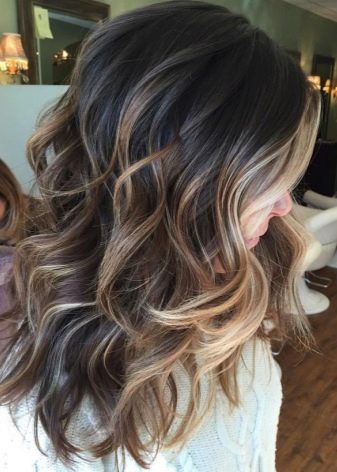 To shade and highlight the dark curls hairdressers offer a combination of strands with white, blond or beige. These options will add shimmering hair shine. These options will add shimmering hair shine. The main thing in the selection of light colors for chestnut and black hair to comply with the technology of smooth flow of colorsso that the balance is gradient and as concise as possible.In this case, an image is created of deliberately careless growth of light blond strands over the entire volume of the hair or in certain layers of the hairstyle depending on the hairstyle.