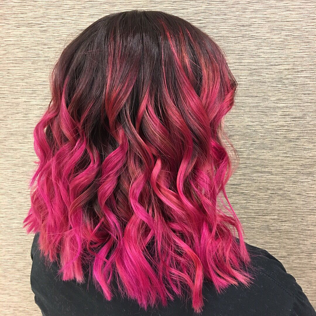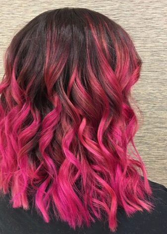 Today, the long-haired hair cut on dark hair is quite popular. To give a similar image of new colors by painting in the style of balayazh, you can use a bright and ultra-modern pink hue. This option will look beautiful on the radically black hair of girls of autumn and spring tsvetotip, giving the image depth with the help of small curls. In addition, the trendy pink balayazh will be the highlight of the image on the hair of brown-haired women with perfectly smooth curls with a smooth color transition.