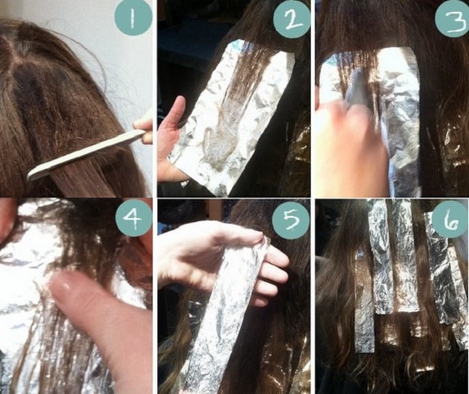 - The next step will be the treatment of the collected and separated hair with a brightener; you should not lighten the hair under the eraser. In order for the substance to work evenly along the entire length, the strands need to be massaged and wrapped in foil. Keep the clarifier should be no more than a quarter of an hour, after which the strands should be washed with water.