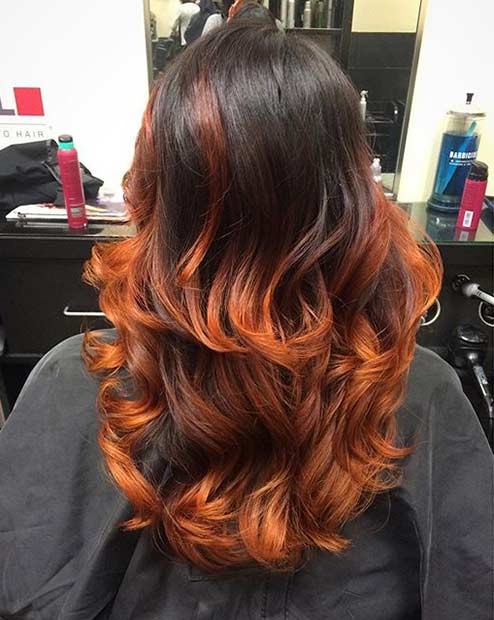 - The black balayazh. Transform red hair will succeed when using black, which allocate the ends or resort to coloring the roots. Such ideas create very beautiful color transitions.In this case, emphasis should be placed on the smooth flow of shades from one to another.