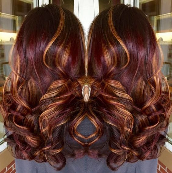 A bold decision for the fiery hair will be the inclusion of contrast black at the roots and at the ends, diluted with rich gold, copper and eggplant color. The created image will not go unnoticed.