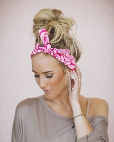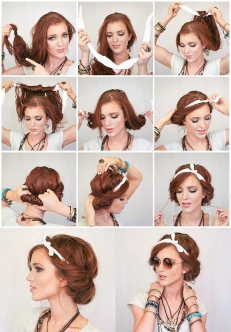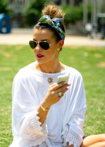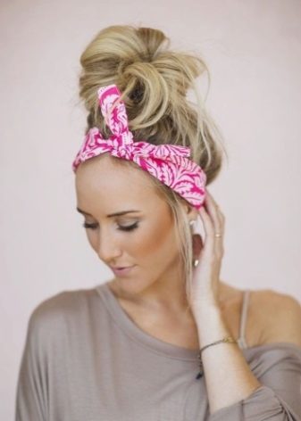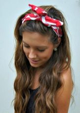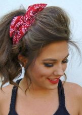 Glamor. We collect hair in a bun and we pin up on a nape. Add volume to the hairstyle with the help of a bouffant in front. Folded in a wide strip bandanu starting from the neck, we spend under the pile and tie in a cute knot. The ends can be hidden or left to hang around freely.