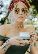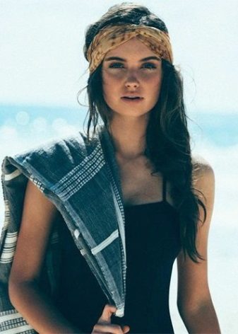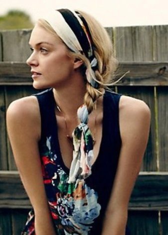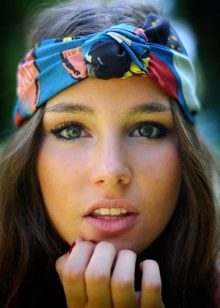 - "Hippie". A triangle is formed from the bandanas, and it is folded several times until a wide strip remains from it. We attach the center of the band to the forehead and fasten it around the head, forming a bezel. Hanging ends are refilled for the resulting bezel.