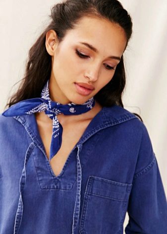 - On the neck. In addition to the classic tying bandanas around the neck in a cowboy way, there is another, no less stylish way. Bandana folds into a triangle. From the base we begin to bend the bandana into a wide strip. We attach the center to the neck and make long ends behind the neck, cross them and bring them forward. It remains to tie the ends in two knots, and ready.
