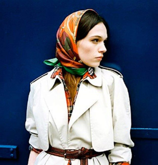 - Classical. We fold a triangle out of the scarf, apply the base to the forehead, and tie the ends on the back of the head, the remaining tip of the scarf is tucked in on the back of the head.