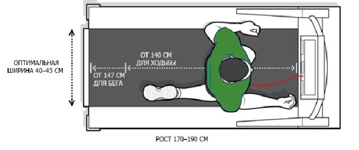 The length of the canvas for walking and running can vary from 95 to 160 cm. Most often it is recommended to use a simulator with a path of 130 cm. With a height of up to 150 cm, you can buy a product with a length of 110 cm, with a growth of 150–160 cm it is better to buy a canvas with a length of 120 cm; at 170–180 cm, the figures should be at least 130 cm, and for growth of 180 or more, 140–150 cm of the track length will be optimal.