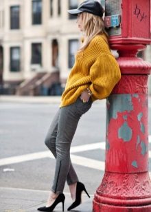 Also, this headdress will be perfectly combined with jeans and a thin knit jumper of a free cut, a T-shirt or a simple shirt with a straight silhouette.