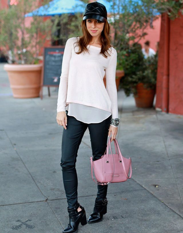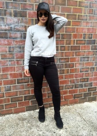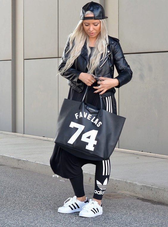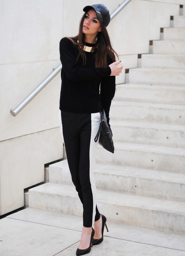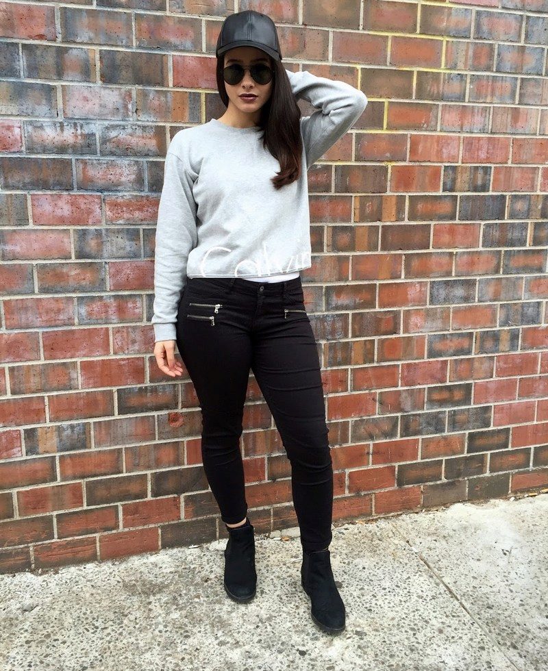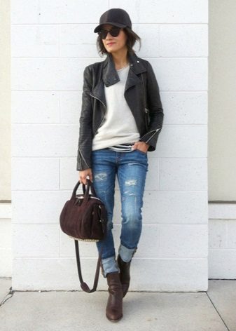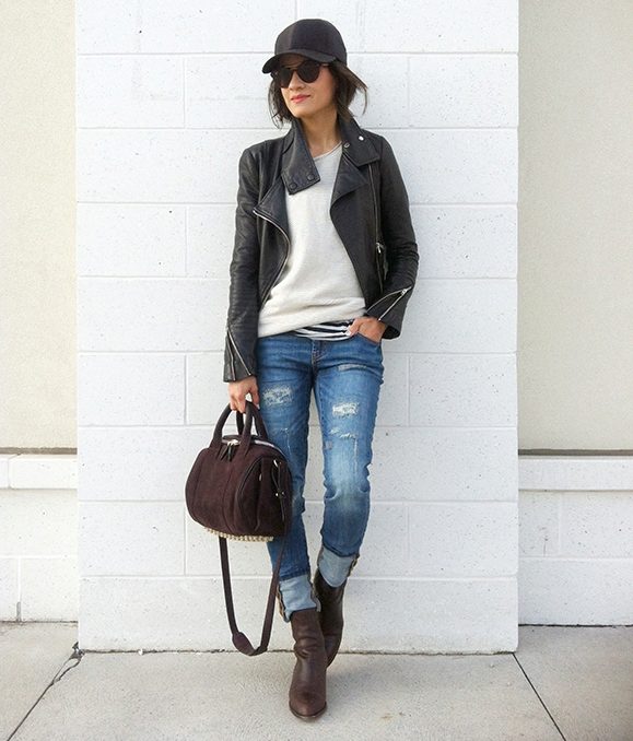 Women's classic look can include a baseball cap, leather jacket or thigh-length jacket, sweater or sweatshirt, plus skinny jeans or black leggings.