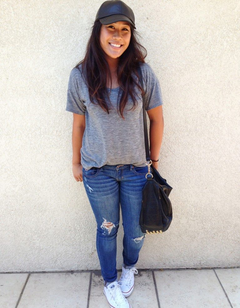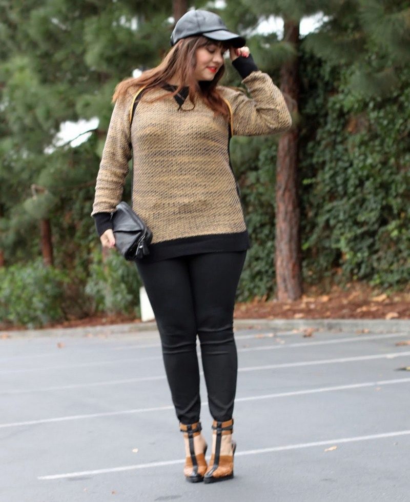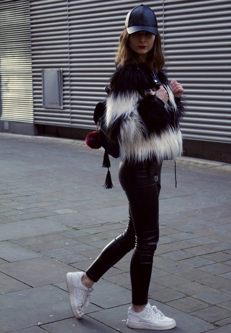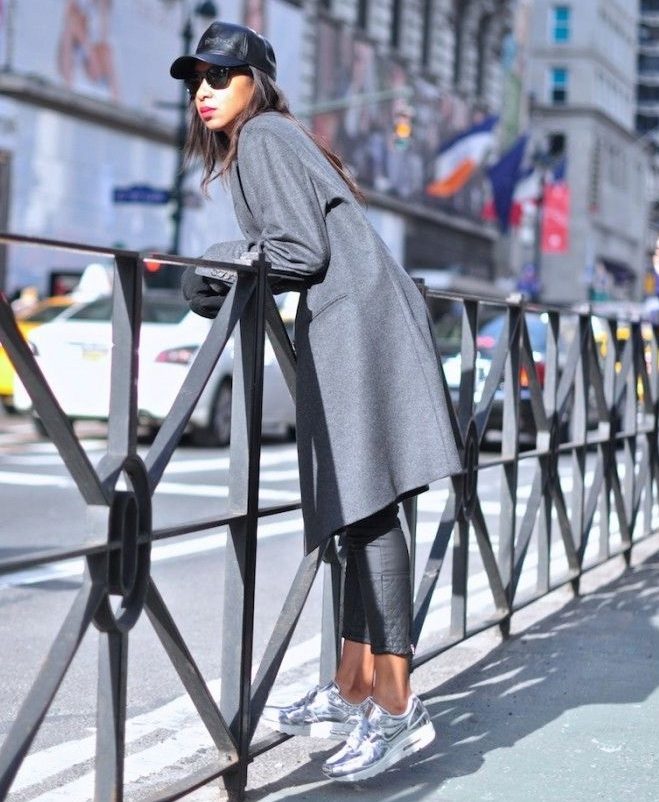 Women's classic look can include a baseball cap, leather jacket or thigh-length jacket, sweater or sweatshirt, plus skinny jeans or black leggings.