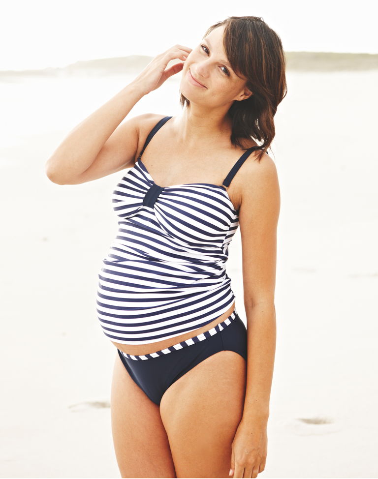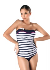 The classic model of the thin stripes tankini from the manufacturer from Germany Laskana. The top on the wide straps through the neck comfortably fixes the chest and covers the growing tummy at the expense of its flared bottom.High black panties with strings on the sides are also adapted to increase the size of the future mom. The price of the German brand in Russian stores passes for 3000 rubles.