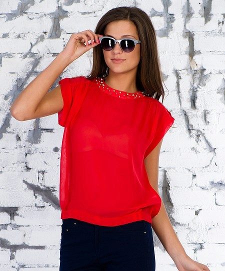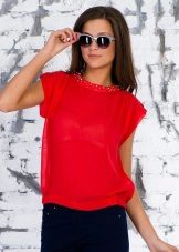 Red blouses will make any look bright and unforgettable. Red color has a lot of spectacular combinations, but more harmoniously, such a blouse will look with a light bottom, for example, with white pants.