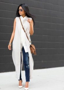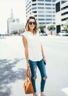 Sleeveless blouses - clothes are even more versatile than models with sleeves. Such blouses can be worn not only with loose outerwear, but also with knitted jackets, boleros and cardigans with long, narrow sleeves. Wear trousers or a skirt as the bottom of the set, and if you have an active day ahead - your favorite jeans.