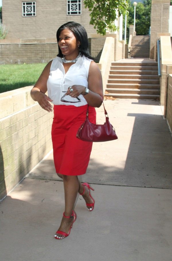 Black blouse, decorated with a spectacular bow on the chest, with a dark red pleated skirt, the same color of the bag and black sandals.