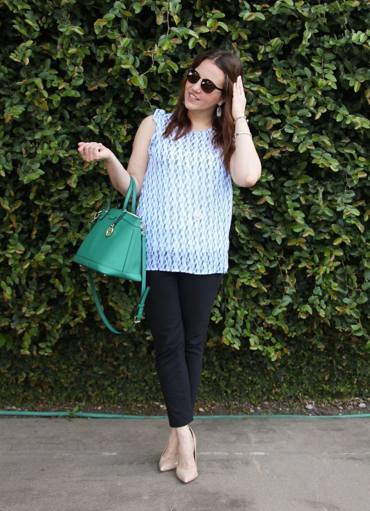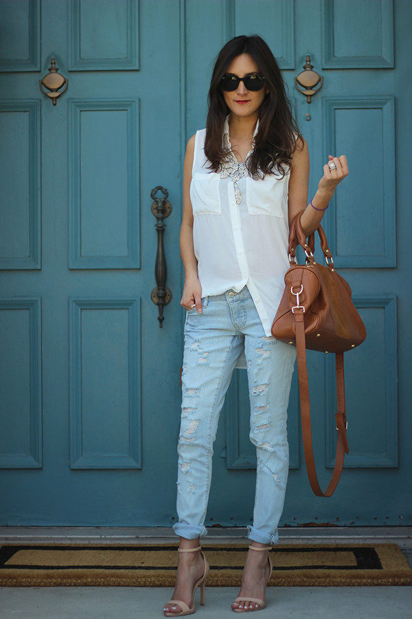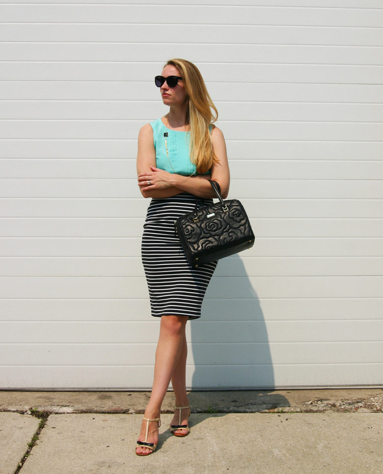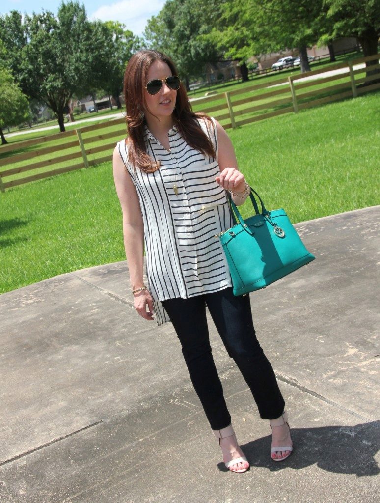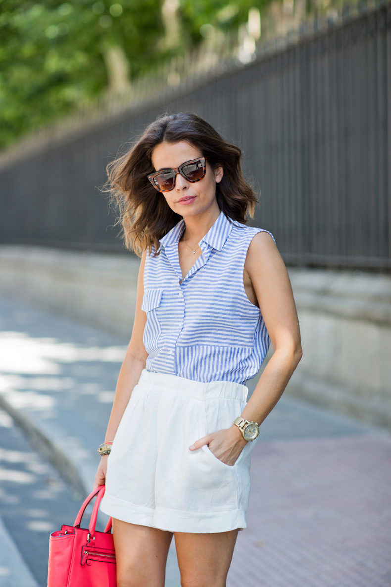 A striped blouse with a perky bow tie looks great with ripped denim shorts, black shoes and a handbag on a long strap.
