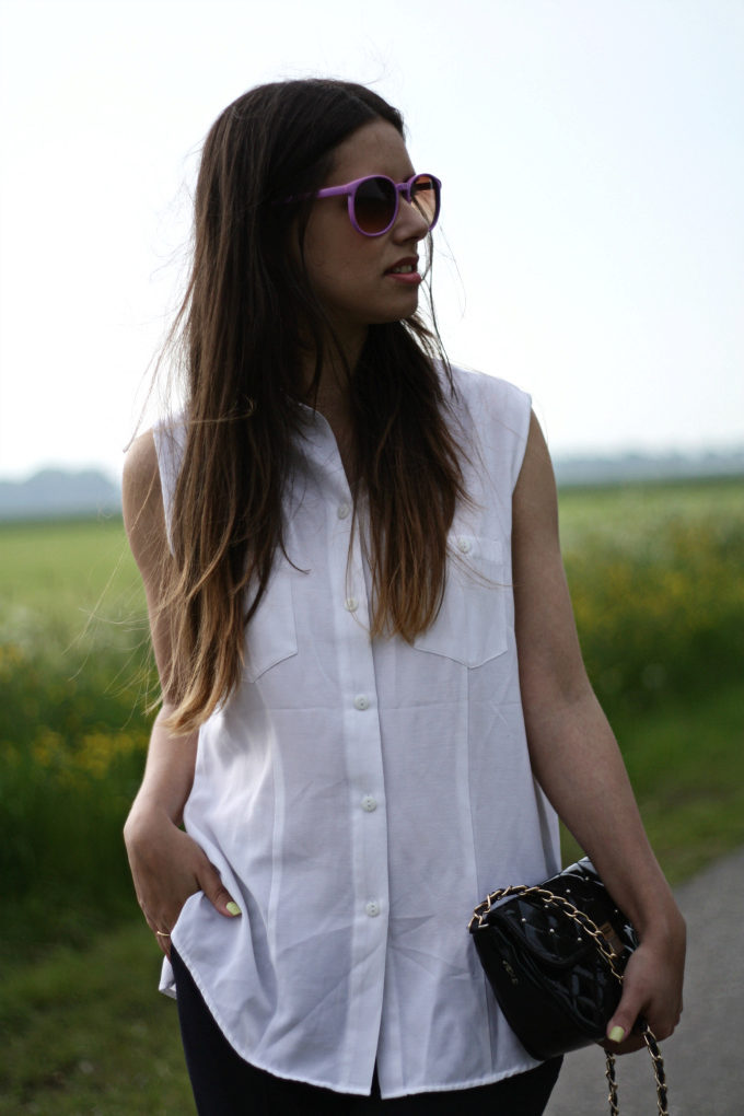 White blouse, decorated with transparent guipure inserts, with black skirt-shorts, black sandals and a bag of neon-yellow color.