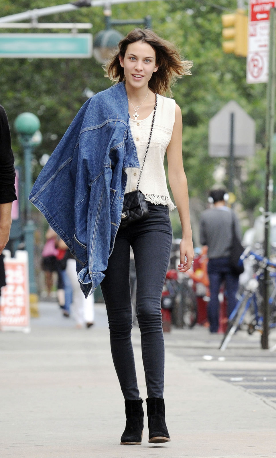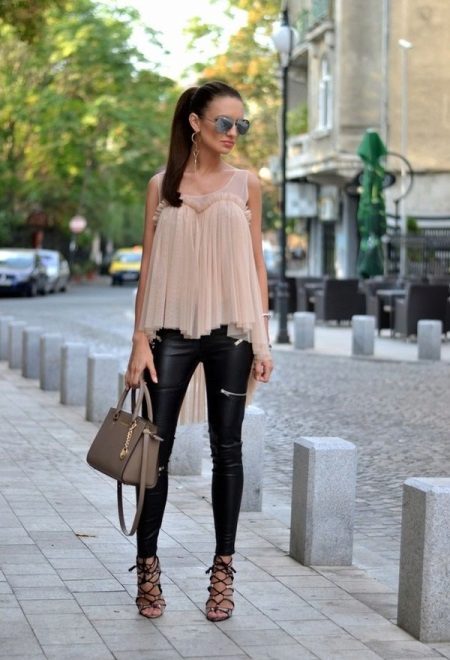 An asymmetric blouse in airy beige chiffon with skin-tight leather pants, delicate sandals on a heel and a voluminous bag.