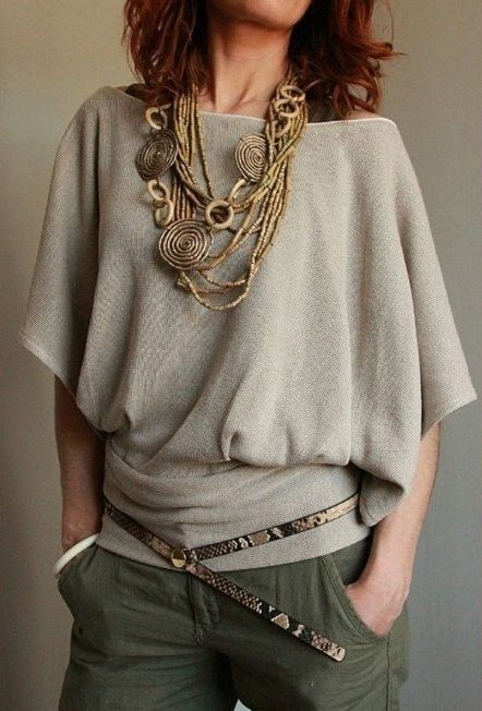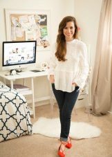 Monochrome laconic style blousons give a wide choice in accessories. But given the femininity of this thing as such, it is not recommended to use massive metal jewelry. To enhance the emphasis on the hips, you can use a wide belt or belt. To draw attention to the upper part of the ensemble, you can use small or large beads with elements of wood and stone, brooches, earrings, rings and scarves.