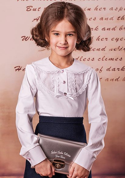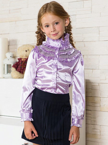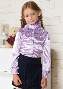 - Elegant blouses are an option "on the way out". In such a blouse you can go to the theater, for a birthday or a matinee. The color scheme of elegant children's blouses differs a great variety, so your princess can choose a model of her favorite color, for example, pink, purple or blue. Such blouses usually have rich decor: lace inserts, rhinestones, beads, satin ribbons and other decorations are used.
