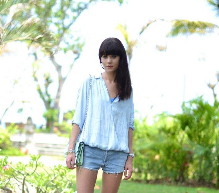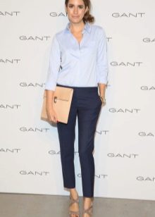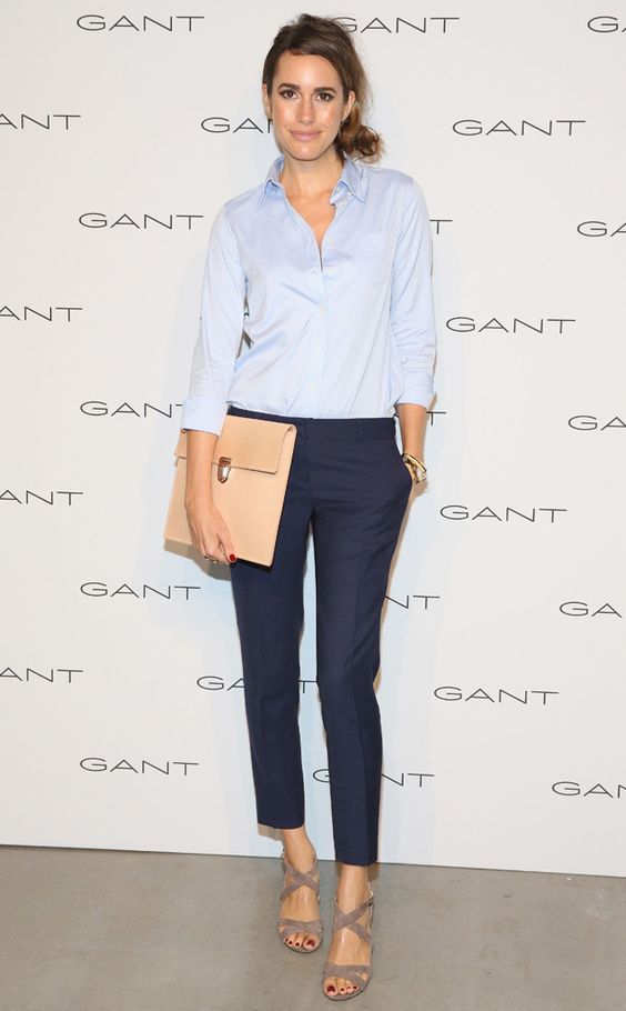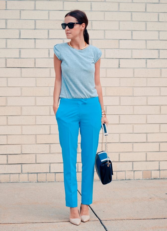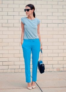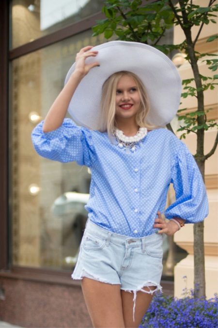 Shorts and a blue blouse are a bold option. You can choose classic shorts or cropped, denim or cotton. Match the shoes according to the style and the occasion.