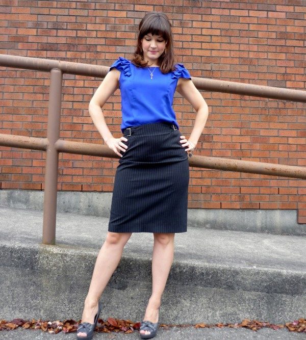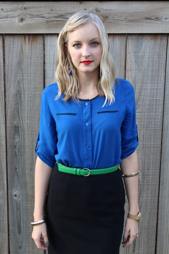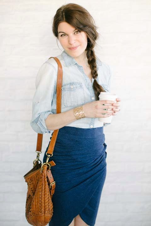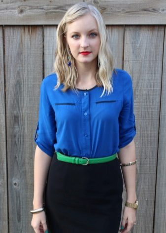To create an office style is not necessary to choose a classic blouse. You can wear a white pencil skirt and a blue blouse. To emphasize the waistline, wear a belt. It is better if it will be in mint or lime shades. Add a bracelet to match the strap and beige open toe shoes.