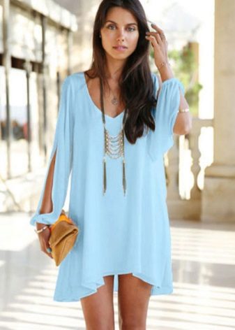 The elongated blouse is a free cut. Well hides full hips and lengthens the silhouette. The tunic can be made of various fabrics, such as cotton or chiffon.