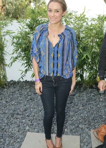 A blue wrap blouse will help shape the waistline of fragile girls. For owners of wide shoulders, it is better to give up the belt in order not to increase shoulders yet.
