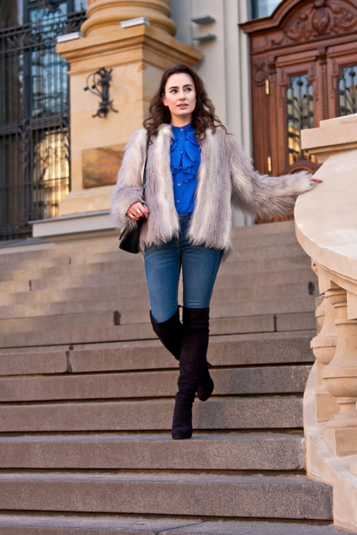 Dark trousers will harmoniously fit into your ensemble. Feel free to wear such a duet for the office.