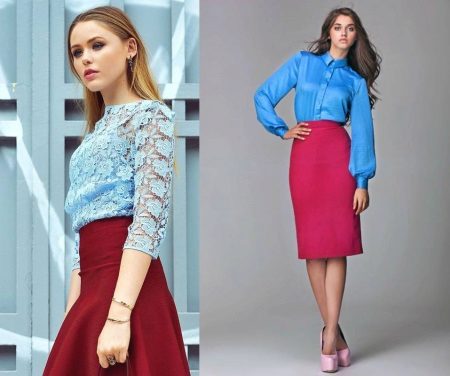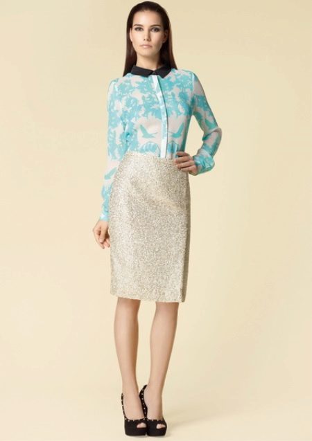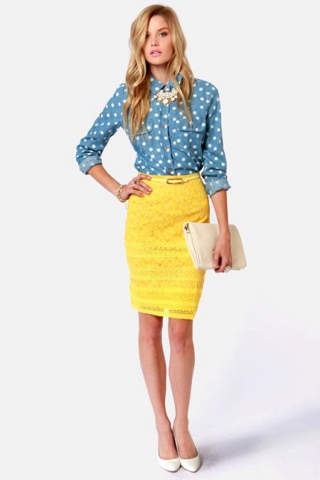 It is better to carry a blue blouse in peas with a monophonic bottom. For example, a polka dot shirt in combination with a yellow guipure skirt.