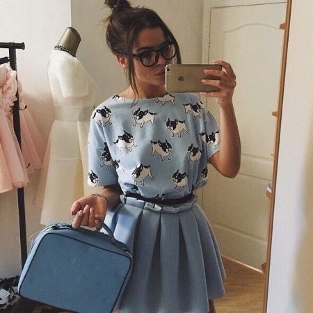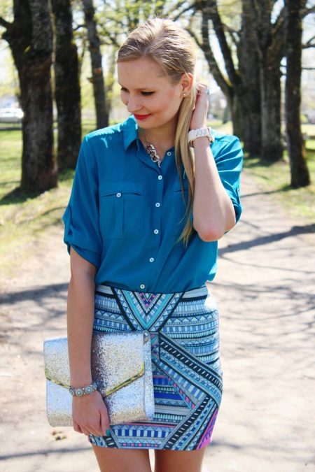 Blue batch file with short sleeves in a duet with a skirt with a geometric print diluted bag of golden color. As accessories, choose jewelry "under the gold."