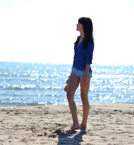 In summer, for walks choose short shorts with a cobalt blouse and shirt. The best thing here is to opt for shoes on a low run.