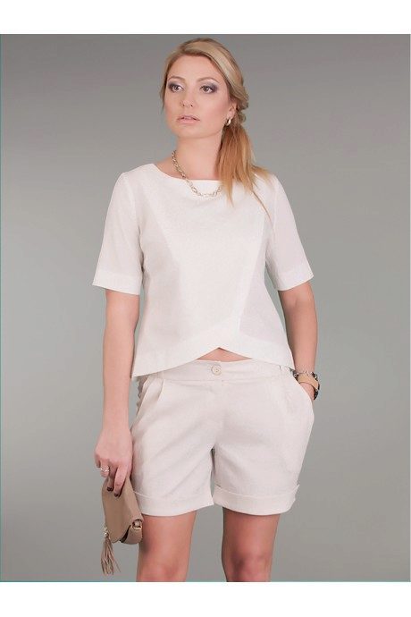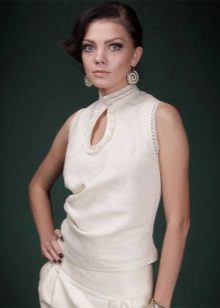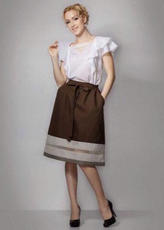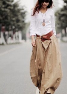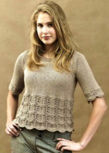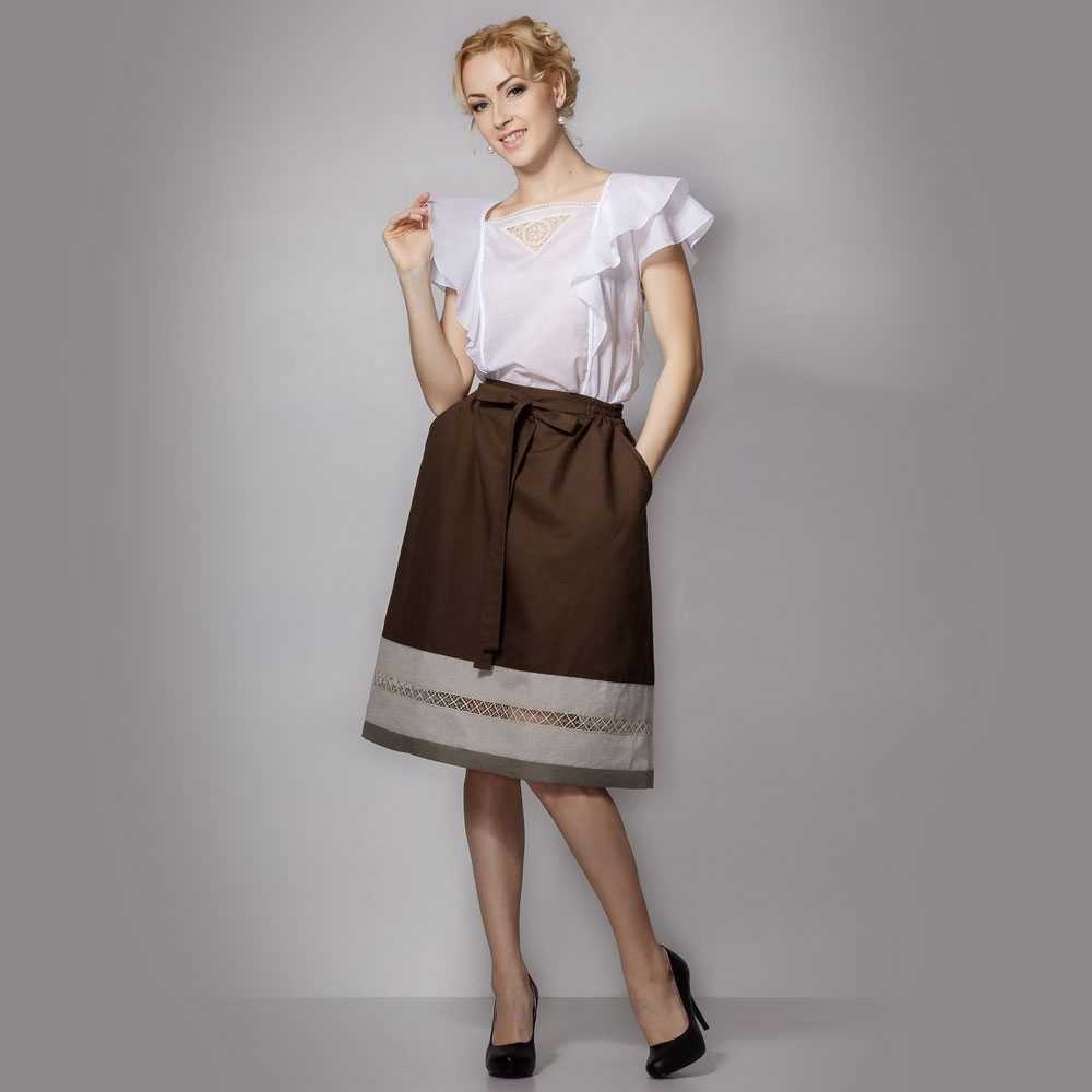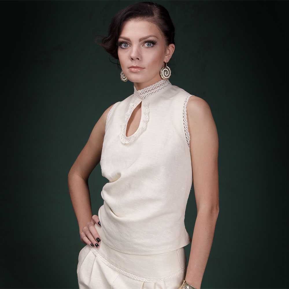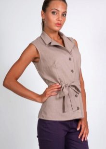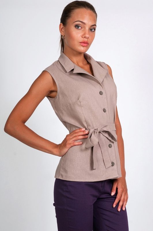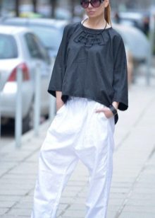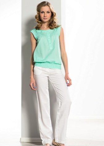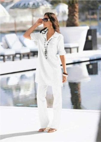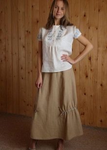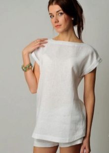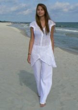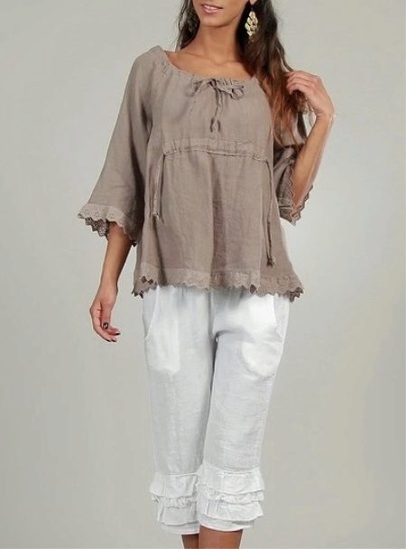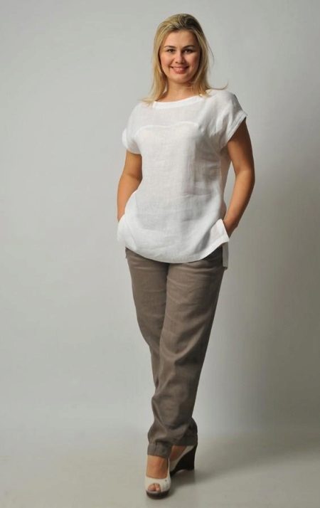 A light summer flax blouse with a boat collar and a spectacularly lowered shoulder line is successfully complemented by brown linen trousers with elastic at the bottom. AT this dress will not be hot even in the heat, and the straight cut of the blouse will hide minor figure flaws.