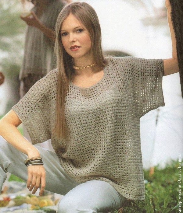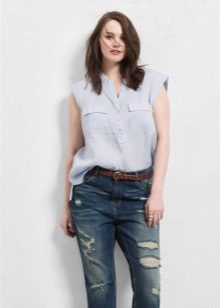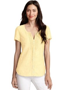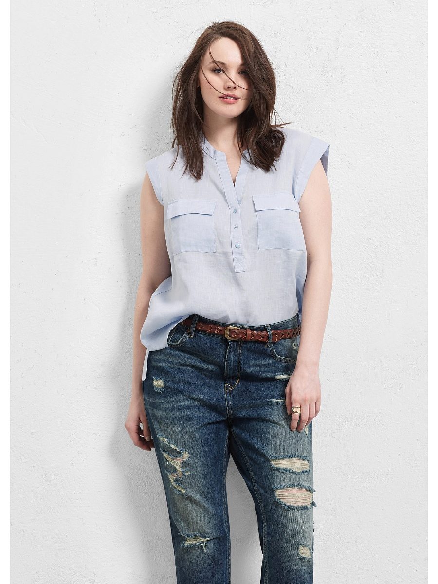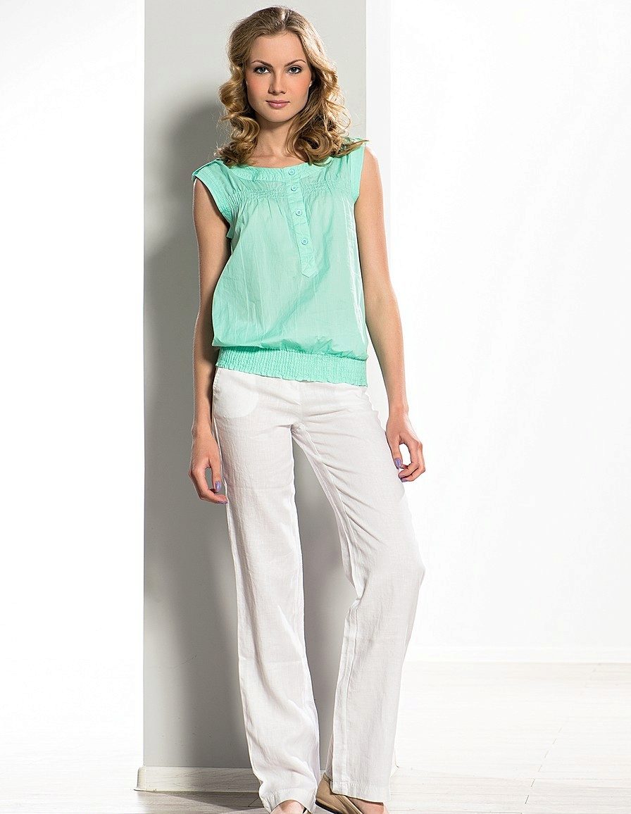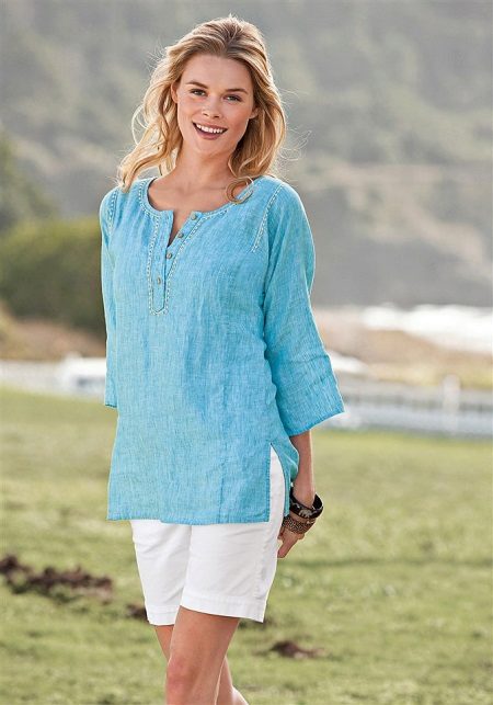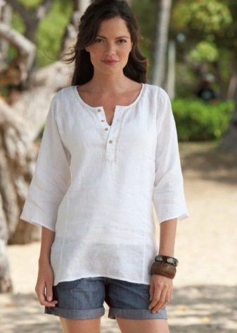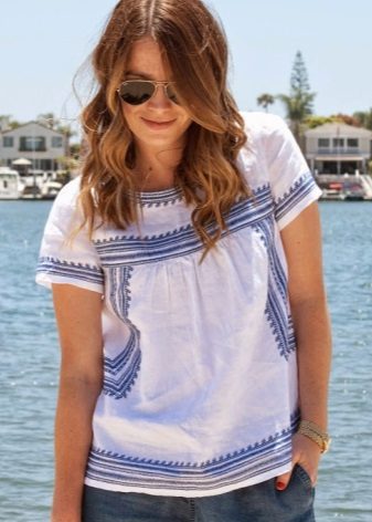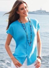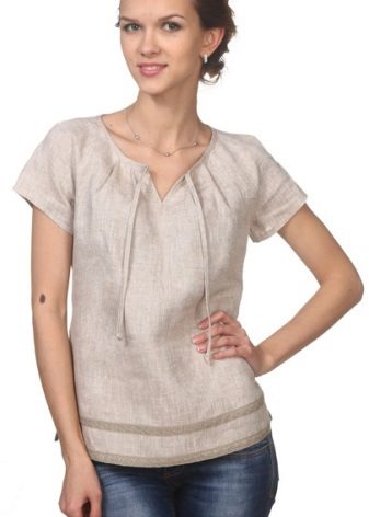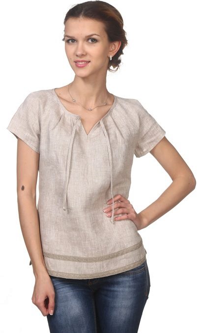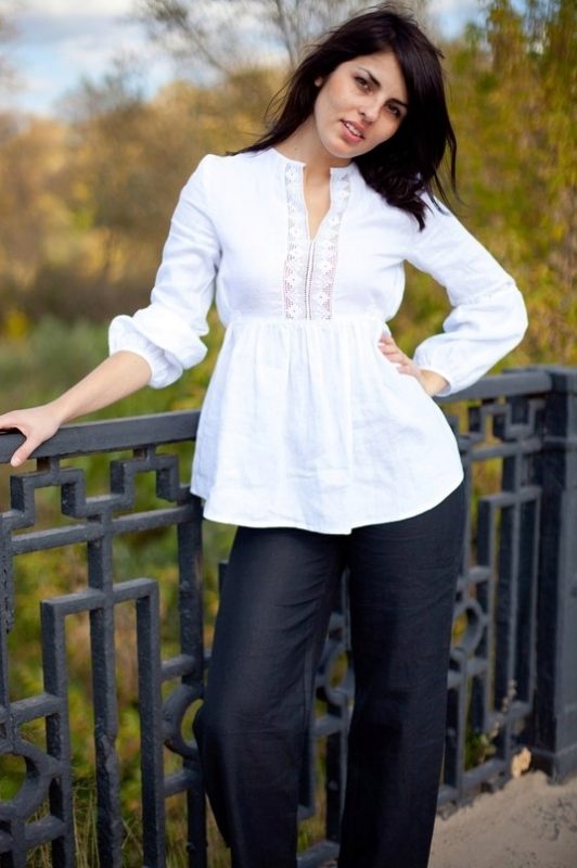 Youth option - a linen blouse with a short sleeve with jeans. Looks fun and at ease. In this outfit you will be comfortable and go shopping and take a walk with friends. For a more spectacular look, a blouse is chosen with a pattern or embroidery.