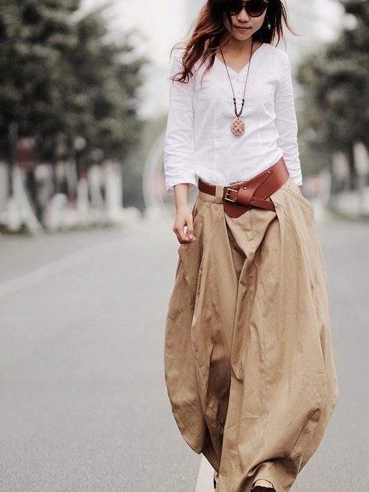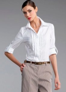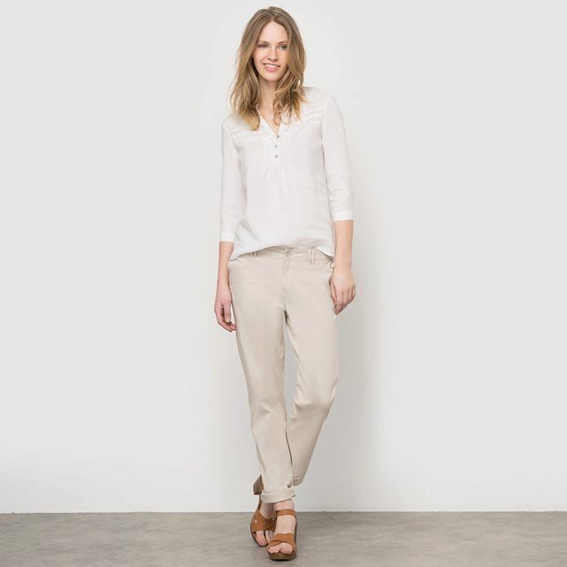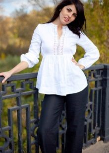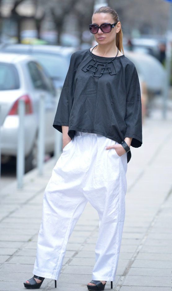 White linen blouse with dark pants