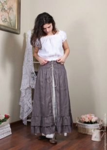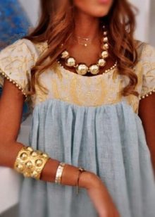 Linen T-shirt or top is worn with trousers of the same material, jeans or denim skirt. Linen fabric is wonderfully combined with wooden decorations and cork-soled shoes.
