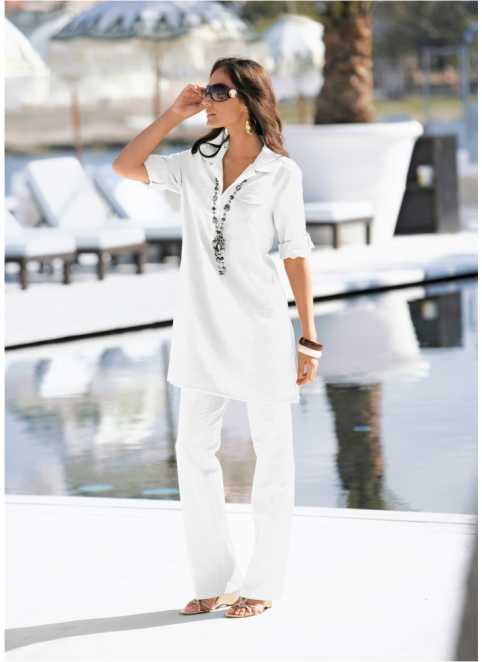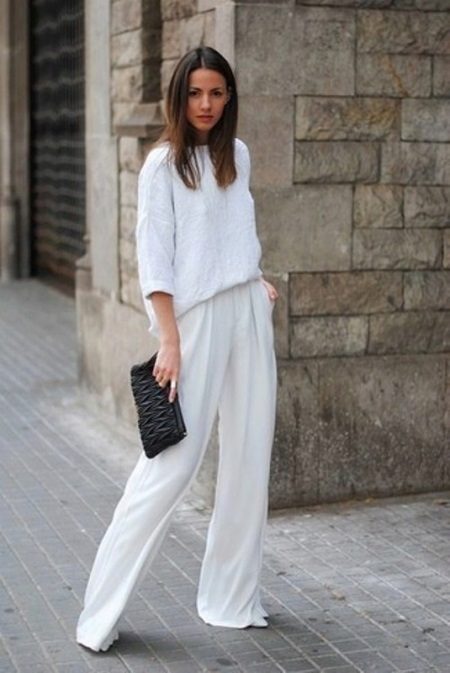 White color - a symbol of purity and freedom. A light spacious white linen blouse with wide white trousers and white sandals will make you irresistible. Easy comfortable and romantic image is perfect for work and for a date. Stylish note - black quilted clutch.