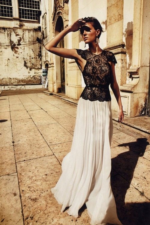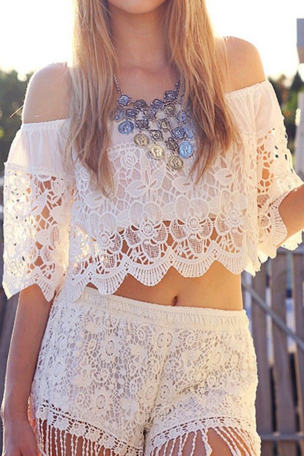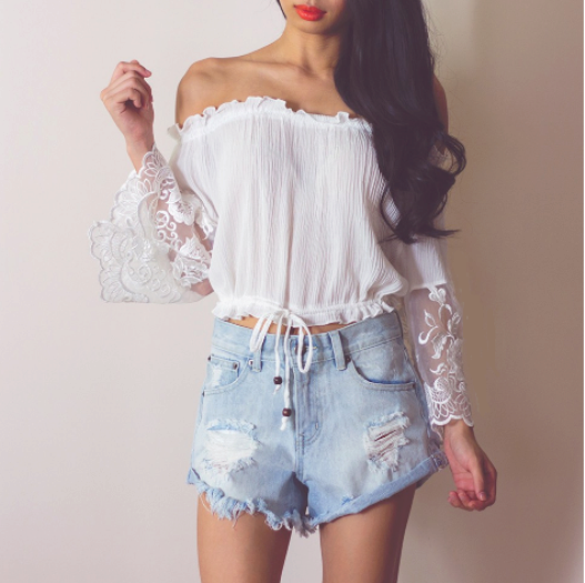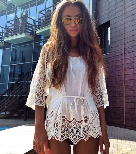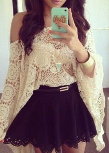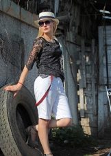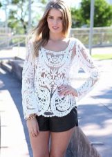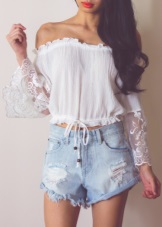 Very bright and seductive image, where the main role is played by a bold model of a frank lace blouse of black color. In combination with short shorts, they represent the perfect outfit for summer vacation, when you can feel free from any framework and conventions.