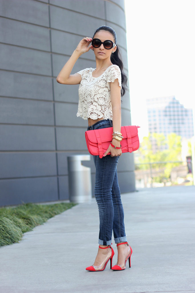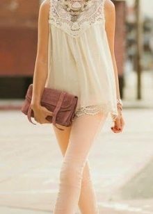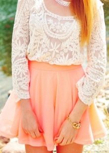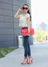 For everyday wear, a lace blouse is an indispensable option, because it can be combined with almost any thing. A bright skirt complete with a single-color blouse and a bodice to match the shoes will look very unusual, no less bright and stylish. Accessories in this manner should be modest and inconspicuous - a clutch bag with a neutral shade will be very useful.