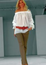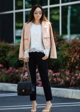 To add some extravagance to a simple white blouse, you can choose a product with a back made of lace. Thus, you will achieve a noticeable dilution of the "fresh" office bow, but you will not go beyond the norms permitted by etiquette.