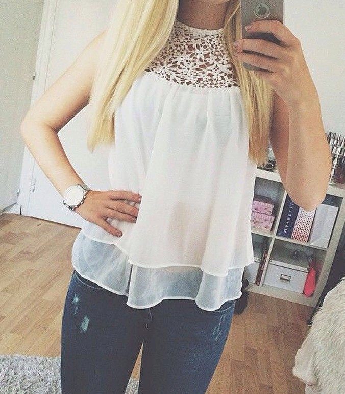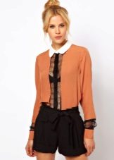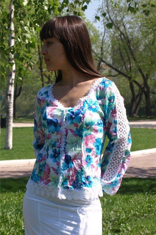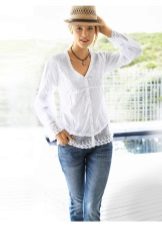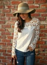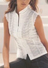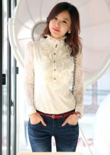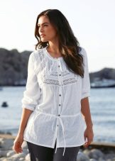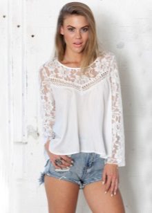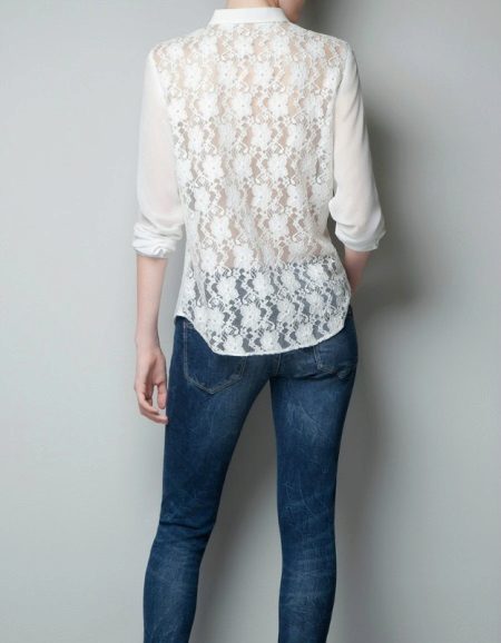 On blouses made of natural fabrics, such as cotton and linen, lace inserts are permissible to do almost anywhere. If the goal is to slightly dilute the boring image, then you can add a transparent lace collar to the blouse.