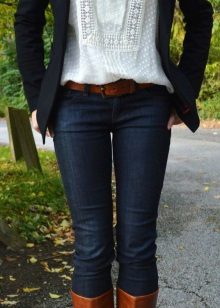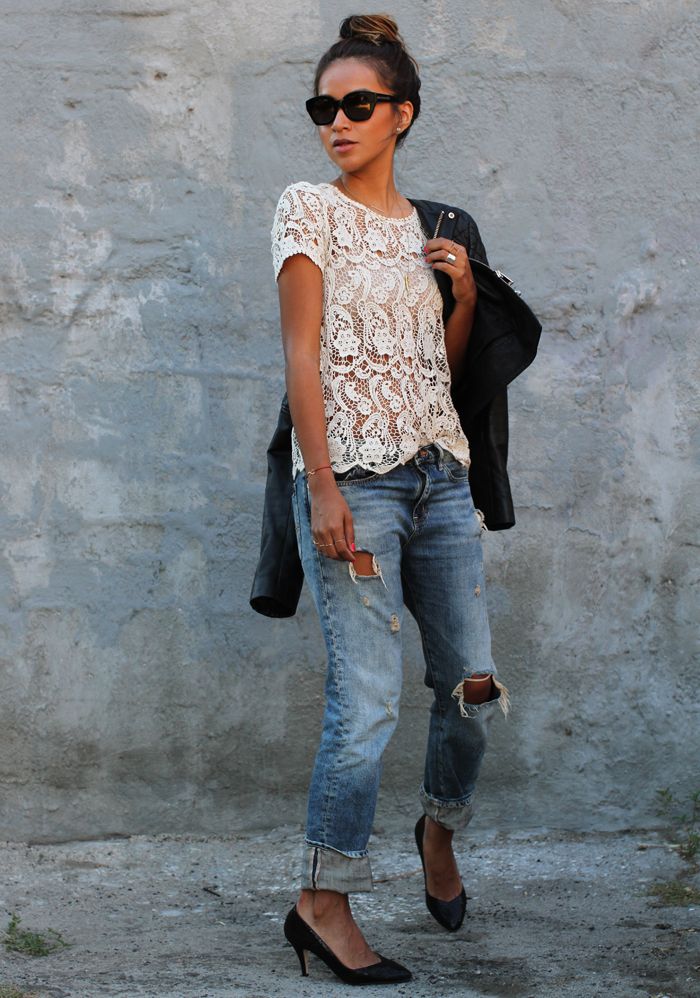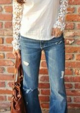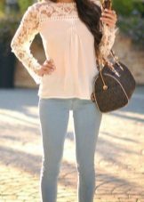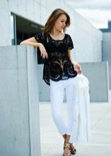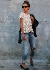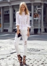 In the presented ensemble, a shortened white lace blouse is perfectly combined with lightweight jeans-pipes. This image clearly demonstrates a competent combination with a frank model of an asymmetrical blouse - the volume of jeans does not overload the image, but, on the contrary, acts as an addition to the most open top, creating complete harmony in appearance.