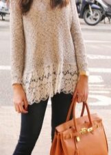 Deserves attention cropped lace blouse with an asymmetrical hem. In a set to it it is necessary to put on trousers or a skirt pencil with a high waist from monophonic dense fabric. But when choosing such an ensemble, it should be remembered that there must be a lining under the lace to avoid unnecessary vulgarity, which implies the presence of open areas of the body in combination with a transparent fabric. Then the bow with this blouse will no doubt be very bright and exciting, but in no way provocative.