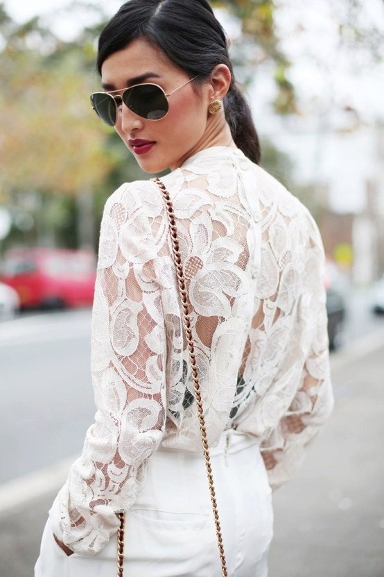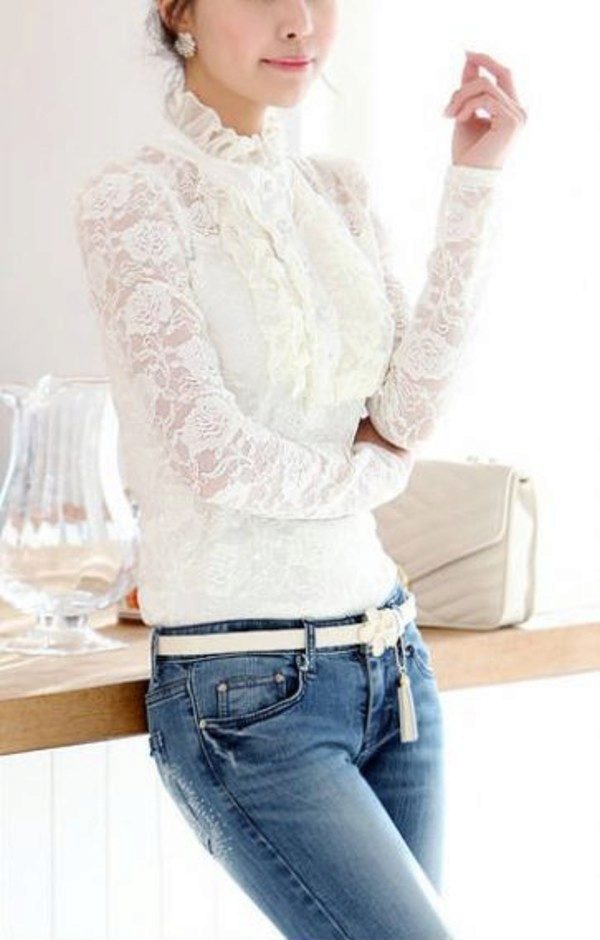 - Since the lace blouse itself is a very vivid detail of the image, accessories and decorations should be chosen modest and not striking the eye.